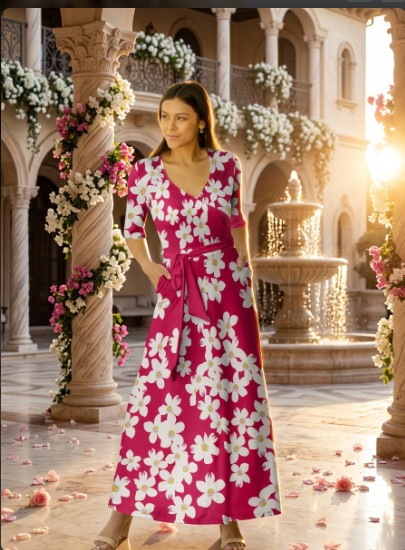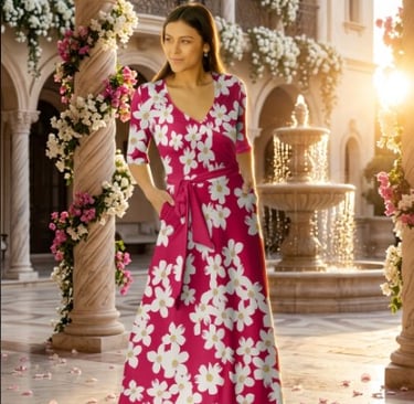 Lily by Firmiana Women's ¾ Sleeve Wrap-Style Maxi Dress with Tie Fuchsia & White Floral